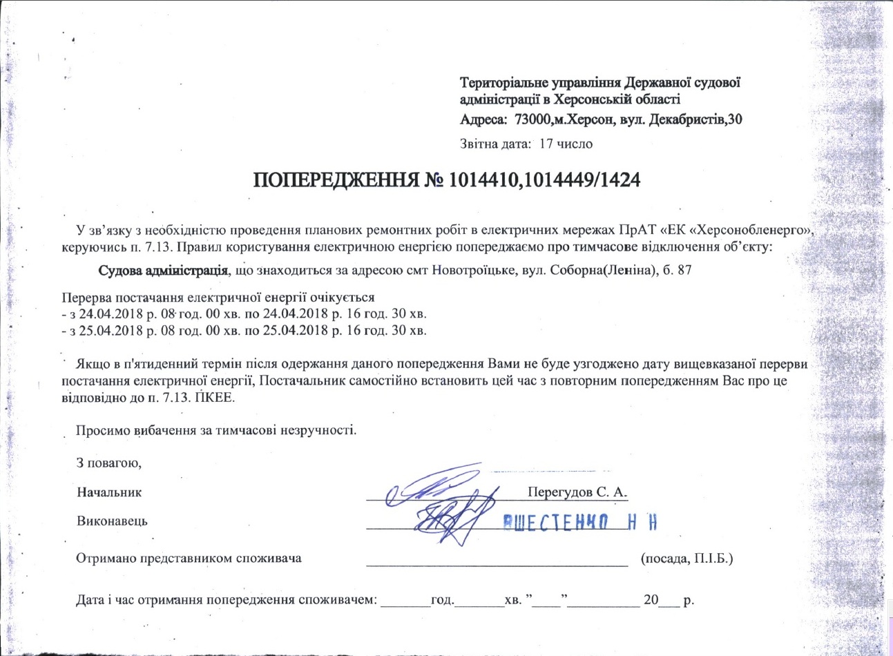 Новотроїцький районний суд Херсонської області повідомляє, що 24.04.2018 року з 08.00 по 16.30 год. та 25.04.2018 року з 08.00 по 16.30 год. буде тимчасове відключення електроенергії.