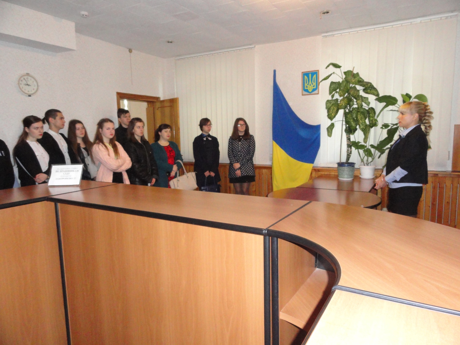Зустріла учнів заступник керівника апарату Жовтоводського міського суду Дніпропетровської області Поліщук З.І.,яка розповіла про історію створення суду, його діяльність та спеціалізацію суддів,ознайомила учнів з порядком пропуску та реєстрації відвідувачів суду.