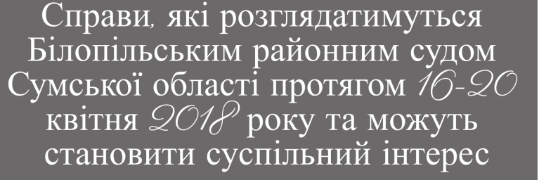 14.00 година 18.04.2018 року кримінальне провадження відносно колишнього начальника кримінальної міліції Білопільського РВ УМВС України в Сумській області Г., обвинуваченого за ч. 3 ст. 368 КК України, та колишнього старшого оперуповноваженого сектору карного розшуку Білопільського РВ УМВС України в Сумській області Є., обвинуваченого за ч. 3 ст. 368, ч. 2 ст. 365 КК. У судовому засіданні будуть досліджуватися письмові докази.