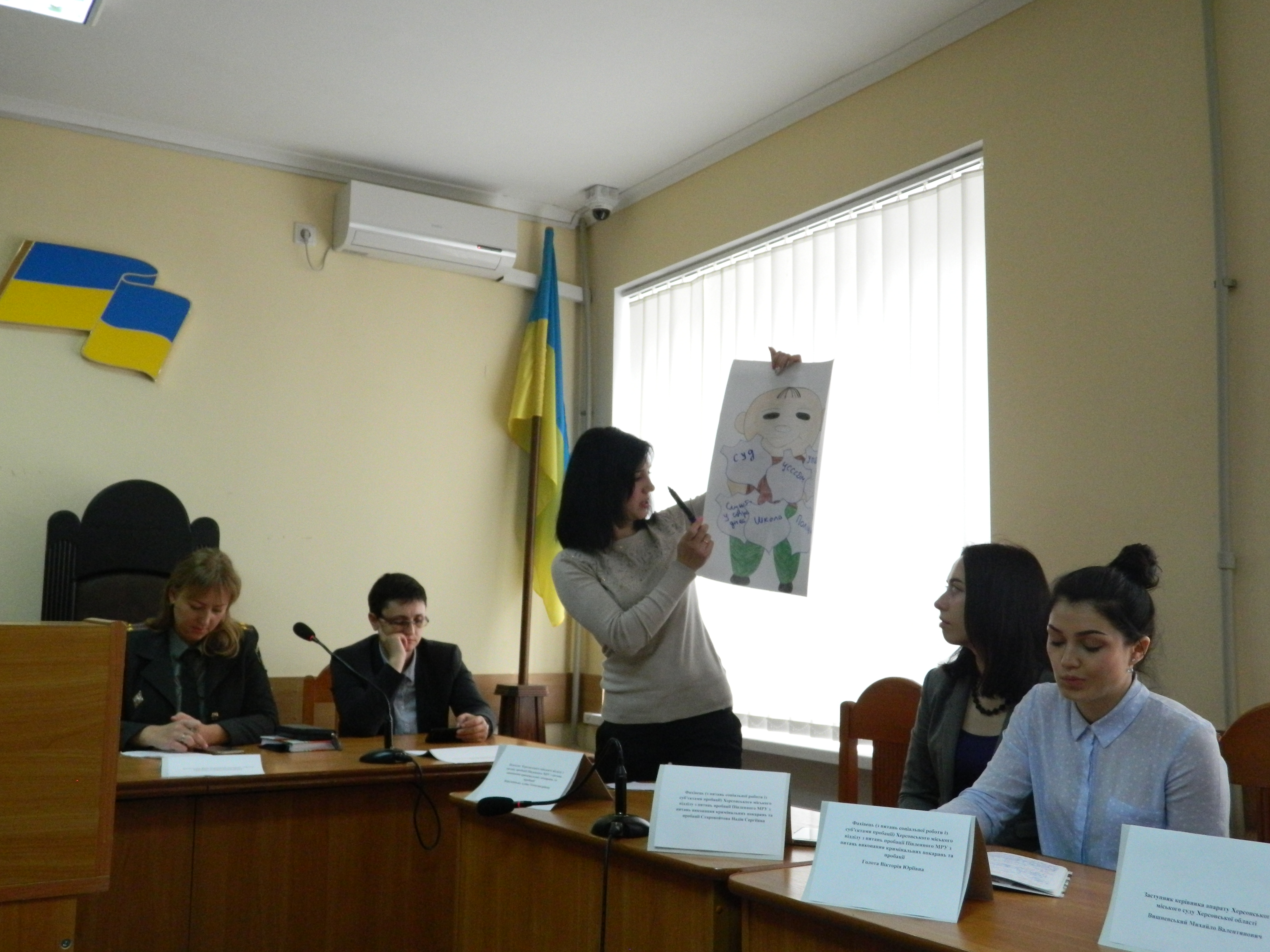 Запрошеними до участі у заході були також представники Херсонського міського відділу з питань пробації Південного МРУ з питань виконання кримінальних покарань та пробації. Зокрема, психологом Березницькою Аліною Олександрівною було роз’яснено учням поняття «права людини», оглянуто презентацію на тему: «Діти мають знати свої права», а також проведено вправу «Температура групи», яка вказала на високий рівень захищеності прав дітей у шкільному закладі, в якому вони навчаються та підтвердив високий рівень виховання правової свідомості учнів цих шкіл. Також, у формі гри психолог окреслила перелік організацій та державних установ, які захищають права дитини у нашій державі.