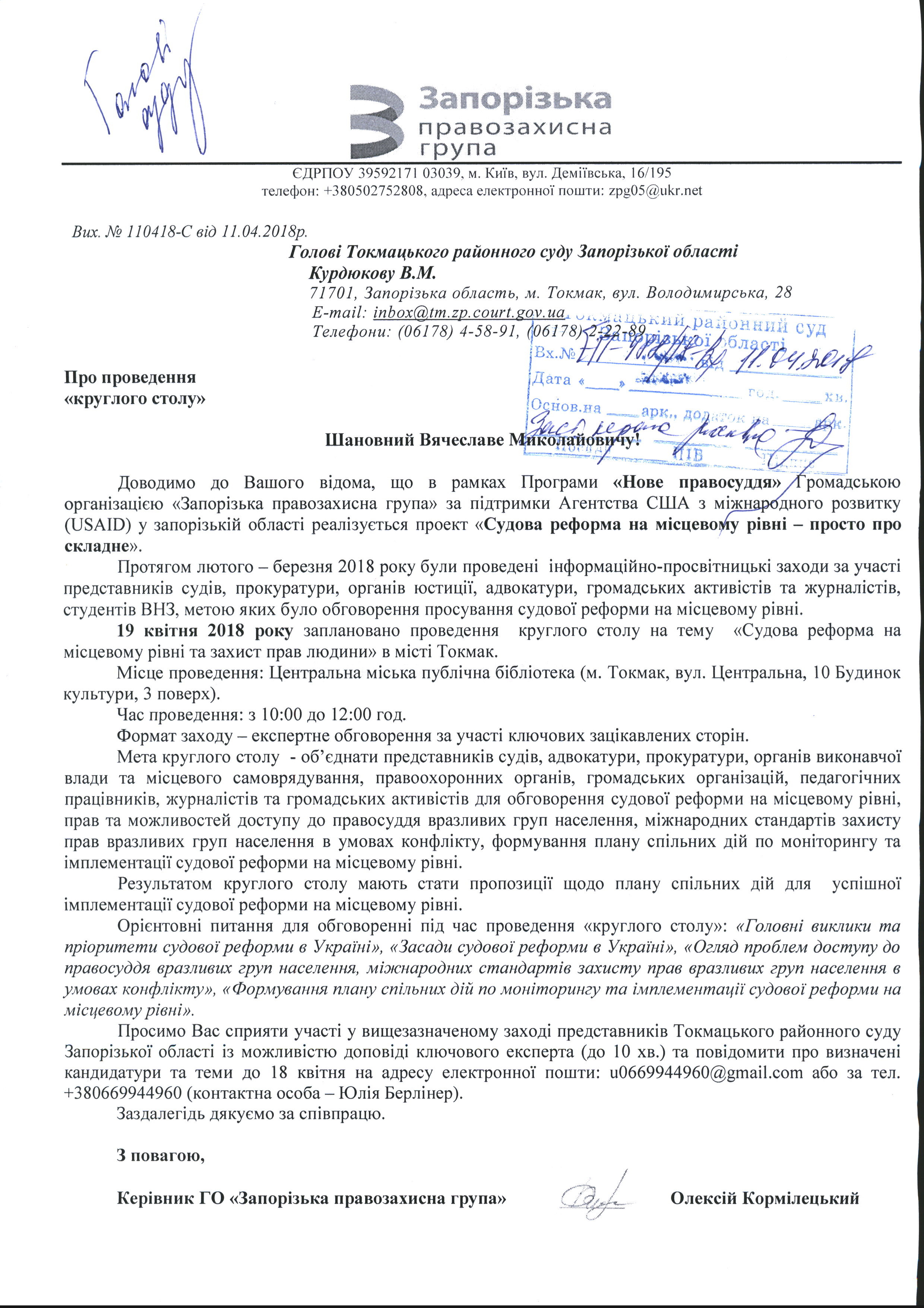 Токмацький районний суд пропонує адвокатам, прокурорам, представникам органів виконавчої влади та місцевого самоврядування, правоохороних органів, громадських організацій, педагогічним працівникам, журналістам та громадським активістам взяти участь в запланованому круглому столі на тему «Судова реформа на місцевому рівні та захист прав людини», який відбудеться 19.04.2018 р.з 10 до 12 години в Центральній міській публічній бібліотеці (Будинок культури).