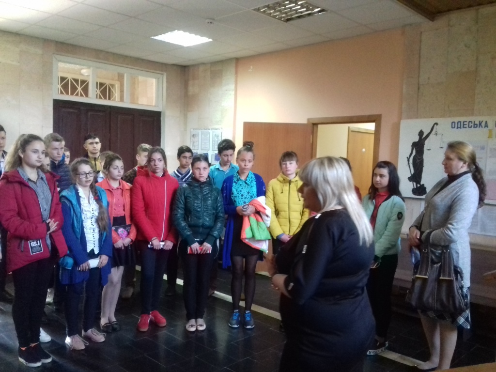 Відкрила захід керівник апарату суду Чернова-Наріжна Оксана Анатоліївна, яка розповіла про історію створення суду, його діяльність, про те, як здійснюється організація роботи апарату Іванівського районного суду Одеської області, які вимоги до працівників та яка відповідальність покладена на них. Також, ознайомила учнів з правилами поведінки в суді та провела гостям невеличку екскурсію судом.
