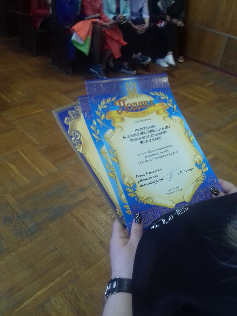 20 квітня 2018 року Іванівський районний суд Одеської області в межах заходу «День відкритих дверей» знову приймав гостей - школярів однієї зі шкіл району. Бажання відвідати суд виявили учні 9-10-х класів Богунівської НВК «ЗОШ І-ІІІ ст. - ДС» Коноплянської сільської ради Одеської області.