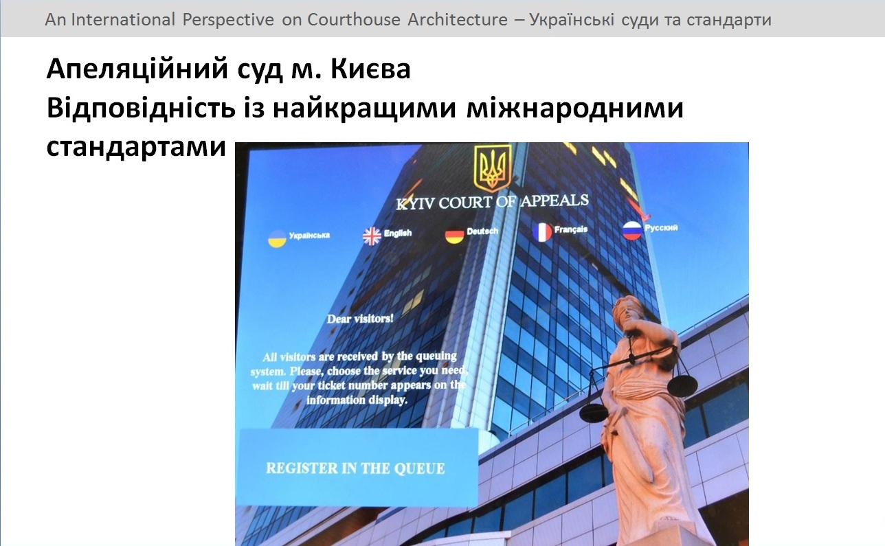 Зокрема, віце-президент Інституту судового управління та ад'юнкт-професор Університету штату Мічиган (Сполучені Штати Америки) Тім Діббл поділився власним досвідом глобального масштабу щодо архітектури будівель судових установ та навів приклади інноваційних рішень у судовому будівництві з практики США та Молдови. Пан Діббл доповів також про результати аналізу українських будівельних норм і правил, встановлених для будівництва судових установ, на предмет їх відповідності сучасним світовим стандартам. «Напередодні мені випала приємна нагода відвідати будівлю Апеляційного суду міста Києва. Хочу відзначити, що тут чітко відстежується прогресивна політика керівництва Апеляційного суду міста Києва, яка спрямована на відновлення довіри громадян до суду, підвищення комфортності та зручності умов перебування відвідувачів. У суді встановлено безкоштовний доступ до мережі Інтернет через Wi-Fi, приміщення суду обладнано стаціонарними універсальними зарядними пристроями для мобільних телефонів та планшетів, встановлено систему електронного керування чергою, що була запроваджена вперше серед судів України саме в Апеляційному суді міста Києва. Подібні інноваційні рішення, що пропонує столичний апеляційний суд у сфері взаємодії суду з громадянами, є необхідними, є вимогою часу, і приємно, що ця судова установа крокує у ногу з ним», – резюмував міжнародний експерт.