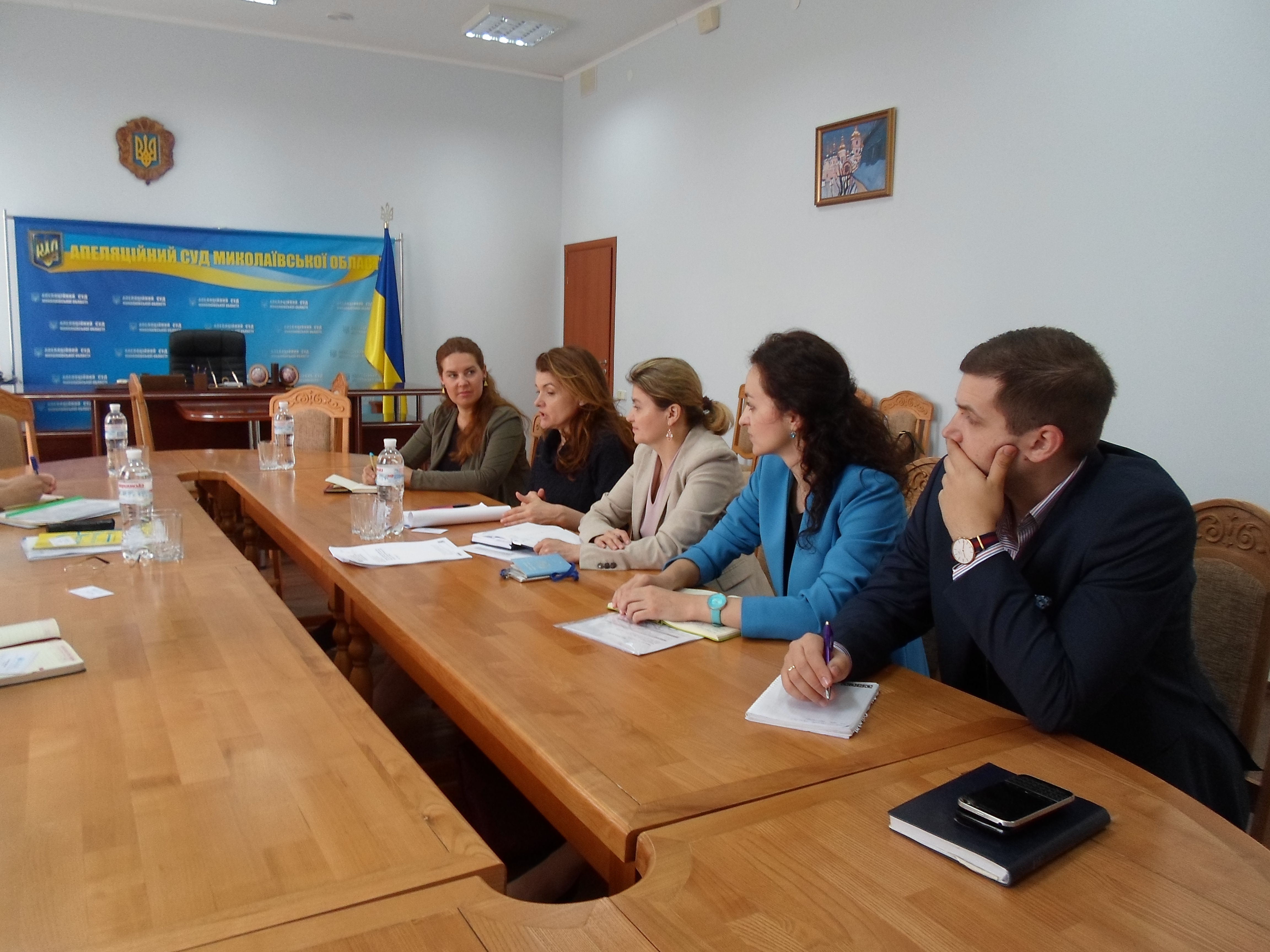 Окрім очільника суду на зустрічі були присутні суддя-спікер апеляційного суду Миколаївської області Галущенко О.І., керівник апарату – Кертичак С.О. та представники Моніторингової Місії ООН.