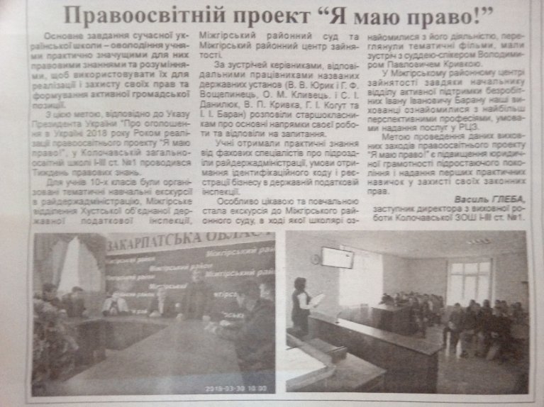 Представляючи інформацію щодо здійснення заходів в рамках правоосвітнього проекту «Я маю право!» заступник директора з виховної роботи Колочавської ЗОШ №1 Василь Глеба повідомив, що «особливо цікавою та повчальною стала екскурсія до Міжгірського районного суду, в ході якої школярі ознайомилися з його діяльністю, переглянули тематичні фільми, мали зустріч з суддею-спікером Володимиром Павловичем».