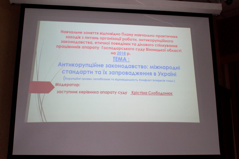 05 травня 2018 року в Господарському суді Вінницької області затупником керівника апарату суду Крістіною Слободонюк поведено навчальне заняття з актуальних питань антикорупційного законодавства