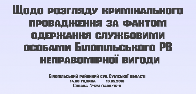 Розгляд кримінального провадження відносно колишнього начальника кримінальної міліції Білопільського РВ УМВС України в Сумській області Г., обвинуваченого за ч. 3 ст. 368 КК України, та колишнього старшого оперуповноваженого сектору карного розшуку Білопільського РВ УМВС України в Сумській області Є., обвинуваченого за ч. 3 ст. 368, ч. 2 ст. 365 КК, відкладено на 14 годину 15 травня 2018 року. У судовому засіданні будуть досліджуватися письмові докази.