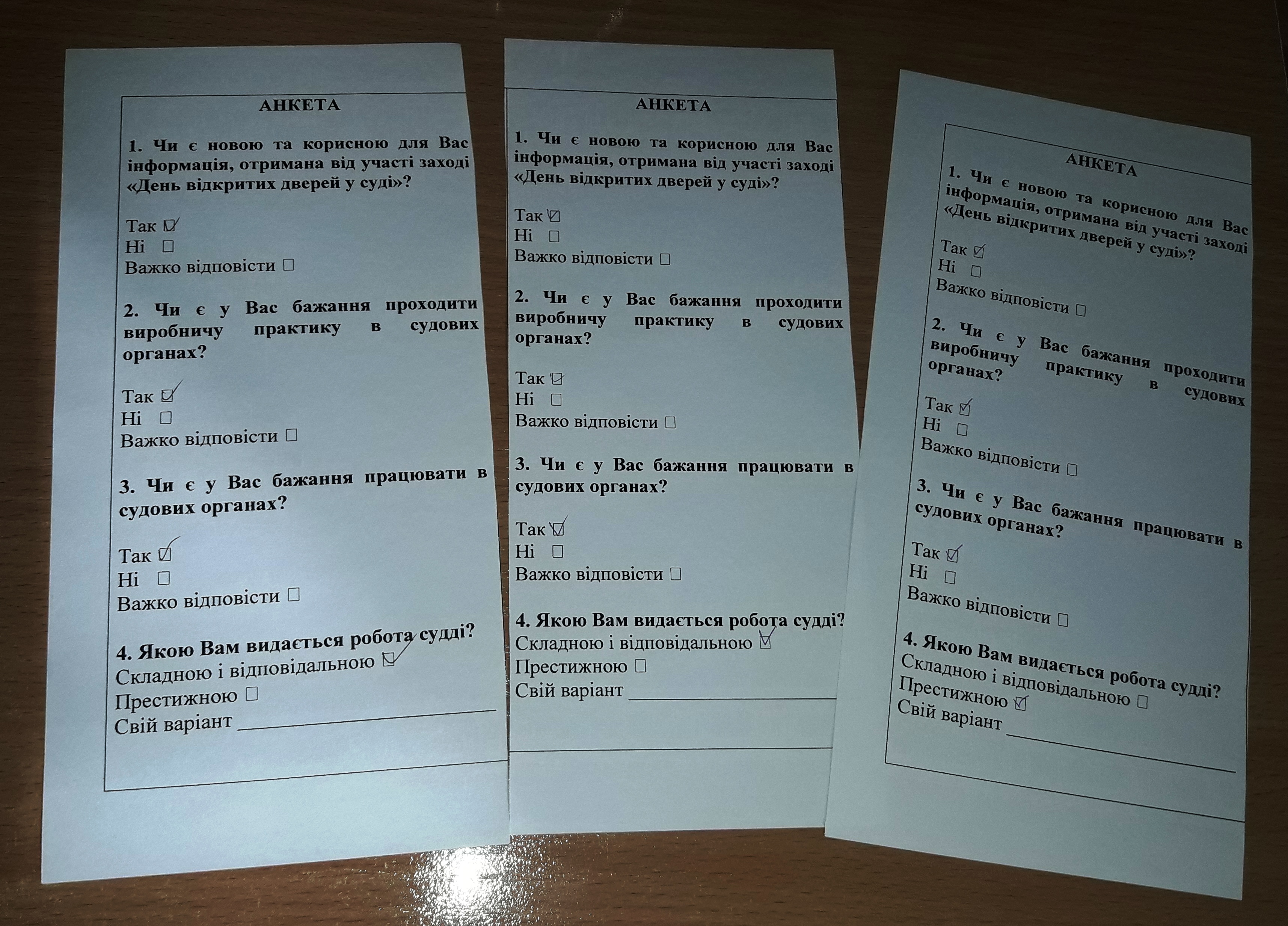 За традицією, по закінченню екскурсії студенти заповнили анкети, де переважна більшість опитаних зазначили про наміри проходити виробничу практику в судових органах та, в перспективі, працювати в судовій системі. Завдяки анкетуванню з’ясувалося, що опитаним посада судді видається складною і відповідальною, та водночас престижною. Для ста відсотків опитаних інформація, отримана у ході екскурсії стала новою і корисною.