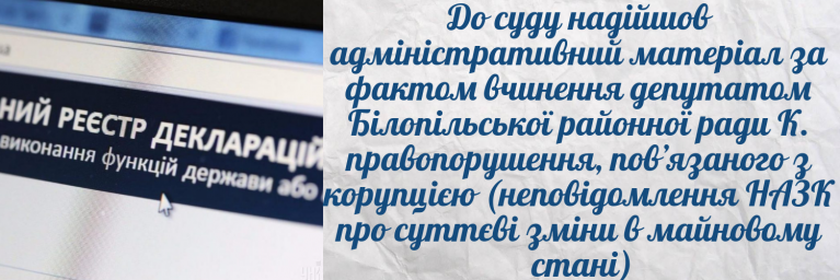 До суду надійшов адміністративний матеріал за фактом вчинення депутатом Білопільської районної ради К. правопорушення, пов’язаного з корупцією, відповідальність за яке передбачена ч. 2 ст. 1726 КУпАП.