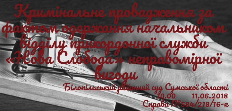 Розгляд кримінального провадження відносно колишнього начальника відділу прикордонної служби «Нова Слобода» Сумського прикордонного загону К., обвинуваченого за ч. 3 ст. 368 КК України, відкладено на 10 годину 11 червня 2018 року. У судовому засіданні будуть допитуватися свідки.