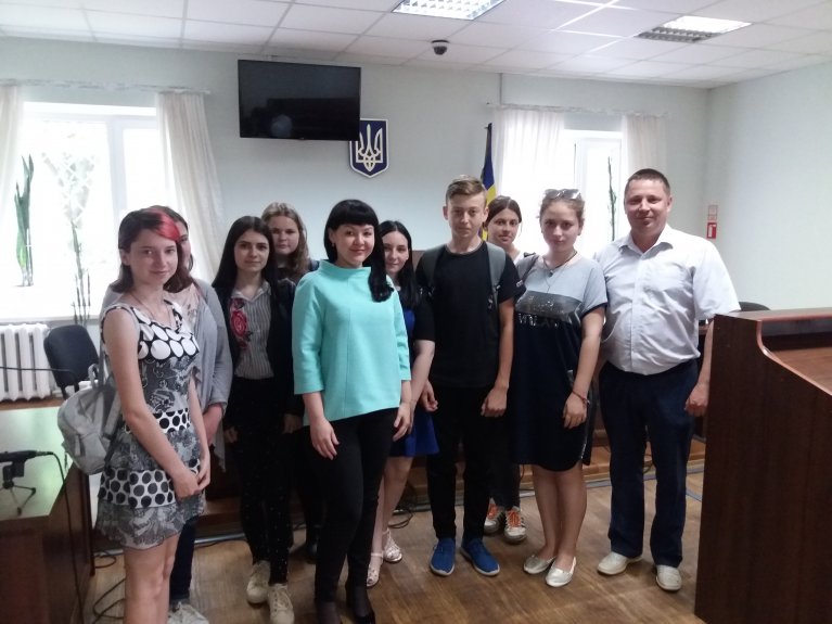 Біля самого входу з вітальним словом до учнів звернулися керівник апарату суду Ізіменко Валентина Володимирівна та заступник керівника апарату Головко Вікторія Костянтинівна і провели їх до кабінету голови суду Пустовар Оксани Савеліївни, яка продемонструвала учням символи судової влади, які є обов’язковими атрибутами судового процесу: мантія та нагрудний знак. Окрім цього Оксана Савеліївна розказала учням про деякі особливості розгляду судових справ, поняття нарадчої кімнати, можливості відео конференцзв’язку, види судових рішень, правила поведінки під час судового процесу і т.д.