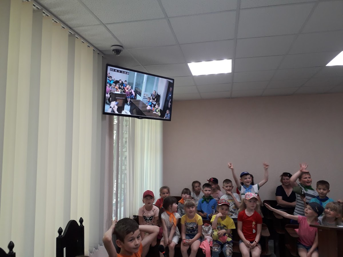 Головний спеціаліст суду Юрій Мартинюк продемонстрував можливості проведення відеоконференцїй судових розглядів у режимі он-лайн часу - надавши можливість юним учасникам зустрічі споглядати на моніторах телеекранів, що встановлені в залі суду, своє відображення.