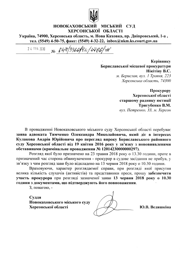 Новокаховським міським судом Херсонської області з метою забезпечення участі прокурора в судовому розгляду справи №647/3366/14-к було направлено повідомлення на адресу Бериславської місцевої прокуратури та прокуратури Херсонської області.