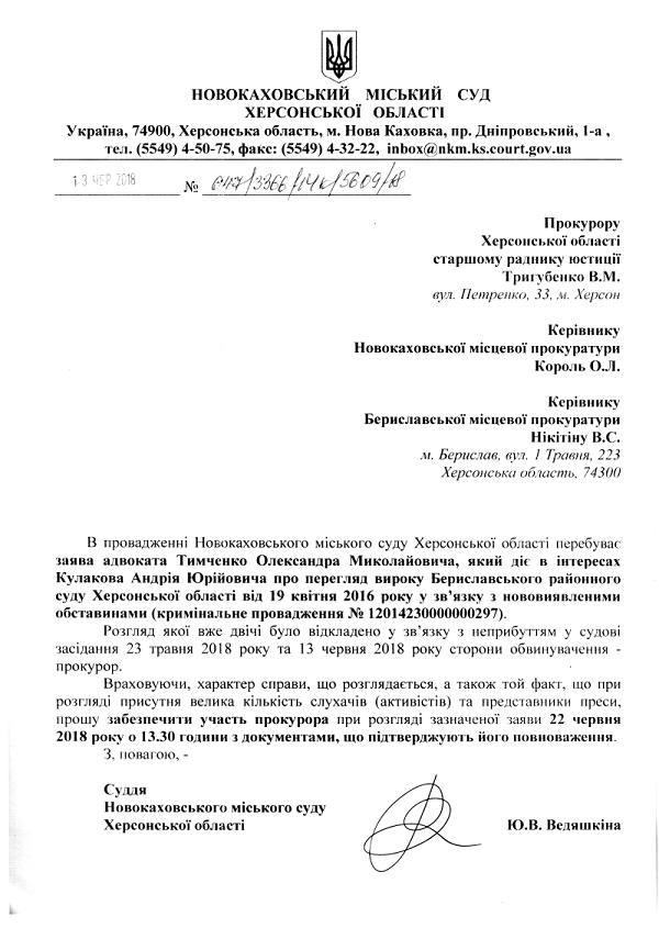 Інформація про неможливість участі представників прокуратури в розгляді вищезазначеної судової справи, викладена в коментарі представника Бериславської місцевої прокуратури, який міститься в статті на сайті UkrPress.info, до Новокаховського міського суду Херсонської області станом на 14 червня 2018 року не надходила.