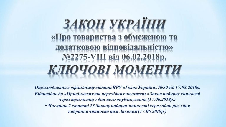 17 червня 2018 року набрав чинності Закон України «Про товариства з обмеженою та додатковою відповідальністю» №2275-VIII від 06.02.2018р.