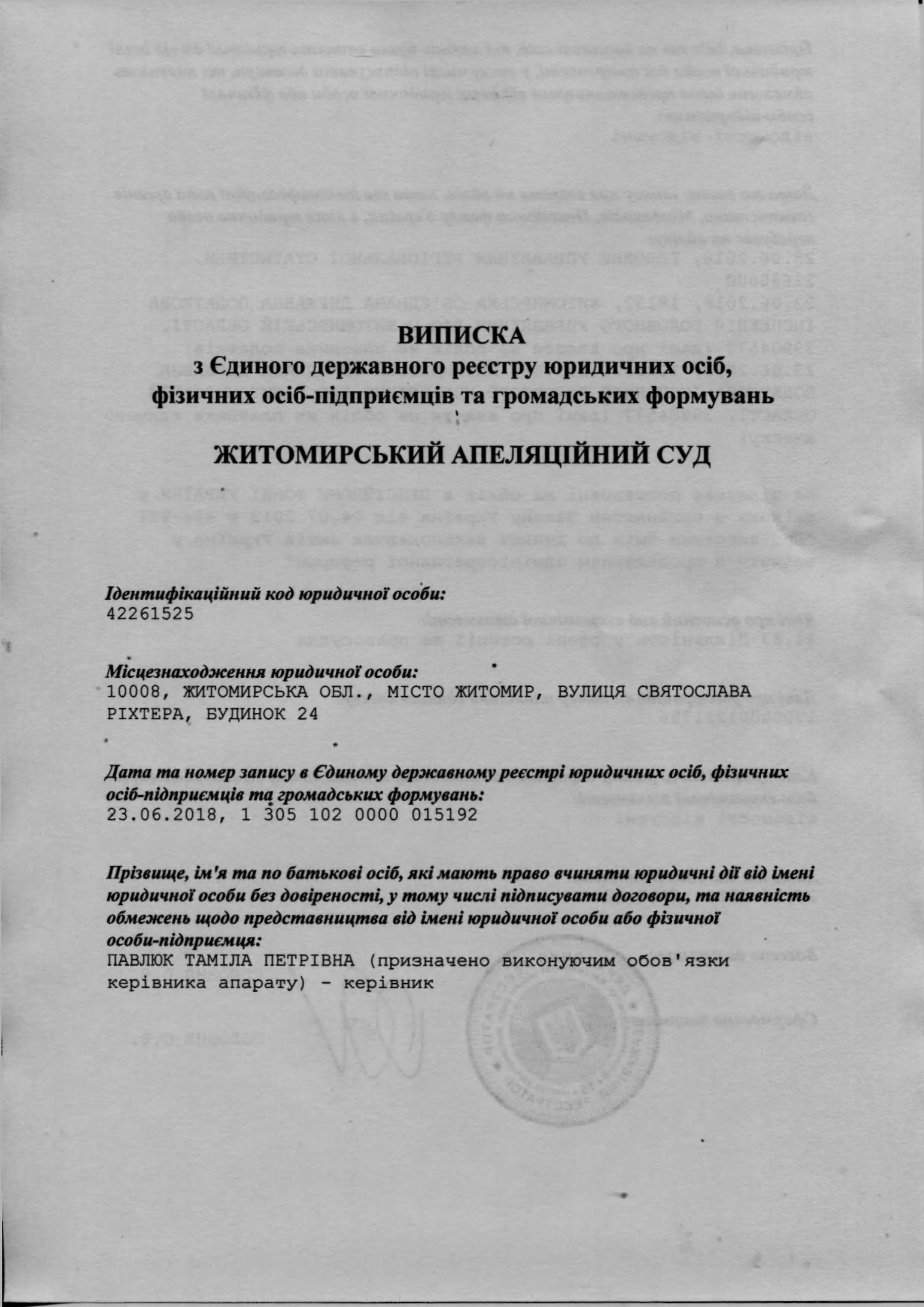 26 червня 2018 року Житомирський апеляційний суд зареєстровано як юридичну особу в Єдиному державному реєстрі юридичних осіб, фізичних осіб-підприємців та громадських формувань.