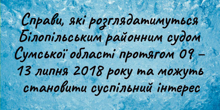 10.00 година 13 липня 2018 року - кримінальне провадження відносно колишнього начальника кримінальної міліції Білопільського РВ УМВС України в Сумській області Г., обвинуваченого за ч. 3 ст. 368 КК України, та колишнього старшого оперуповноваженого сектору карного розшуку Білопільського РВ УМВС України в Сумській області Є., обвинуваченого за ч. 3 ст. 368, ч. 2 ст. 365 КК. У судовому засіданні будуть досліджуватися письмові докази.