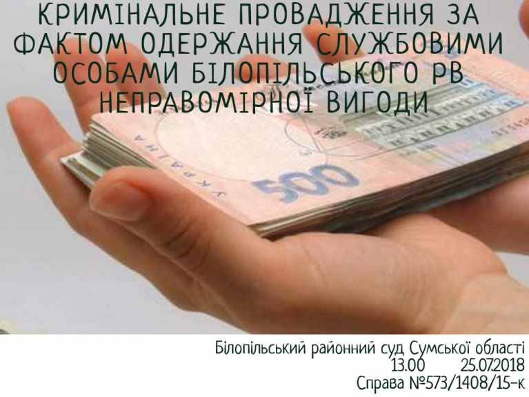 Розгляд кримінального провадження відносно колишнього начальника кримінальної міліції Білопільського РВ УМВС України в Сумській області Г., обвинуваченого за ч. 3 ст. 368 КК України, та колишнього старшого оперуповноваженого сектору карного розшуку Білопільського РВ УМВС України в Сумській області Є., обвинуваченого за ч. 3 ст. 368, ч. 2 ст. 365 КК, відкладено на 13:00 годину 25 липня 2018 року. У судовому засіданні досліджувалися письмові докази. У наступному судовому засіданні дослідження доказів буде продовжено.