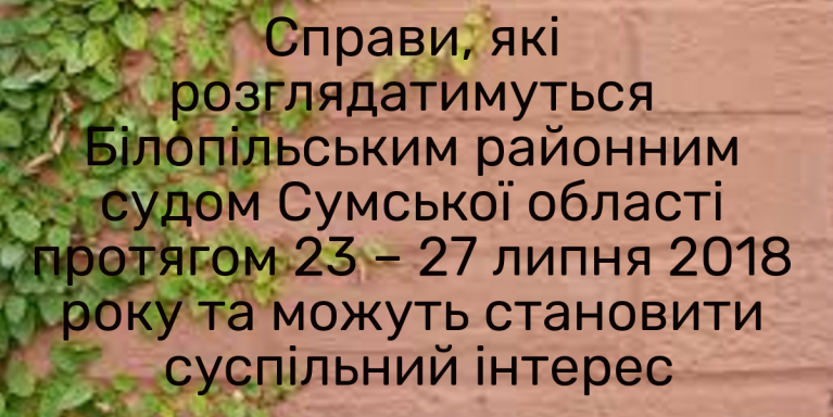 13.00 година 25 липня 2018 року - кримінальне провадження відносно колишнього начальника кримінальної міліції Білопільського РВ УМВС України в Сумській області Г., обвинуваченого за ч. 3 ст. 368 КК України, та колишнього старшого оперуповноваженого сектору карного розшуку Білопільського РВ УМВС України в Сумській області Є., обвинуваченого за ч. 3 ст. 368, ч. 2 ст. 365 КК. У судовому будуть досліджуватися докази.