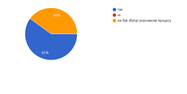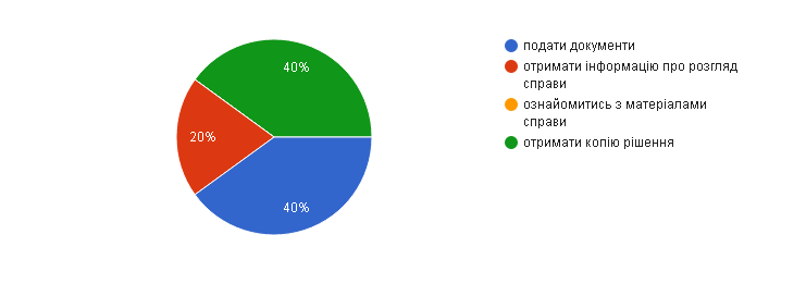 Аналізуючи відомості щодо характеристики респондента стало відомо, що загалом громадяни звертались до суду: щоб подати документи – 40 %, отримати інформацію по справі – 20 %, отримати копію рішення суду – 40%.