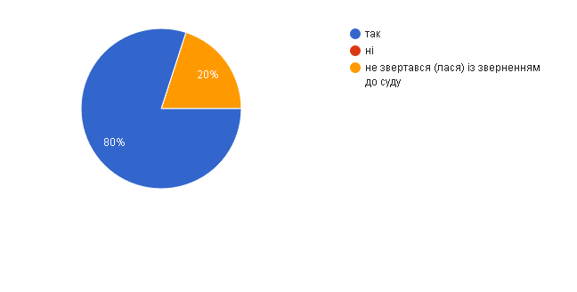 Оцінюючи дотримання судом термінів при розгляді звернень, визначених Законом України "Про звернення громадян", 80 % опитуваних вказали у десятому блоці питань про вчасність такого розгляду. 20% опитуваних з цього приводу до суду не зверталось.