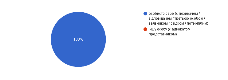 За результатами відомостей другого блоку питань, отриманих під час проведення опитування громадян – відвідувачів суду, слід зазначити, що громадяни при зверненні до суду представляли особисто себе (є позивачем, відповідачем/третьою особою/заявником/свідком/потерпілим).