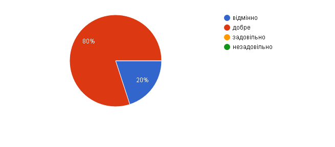 Аналізуючи третій блок питань, які стосуються перебування відвідувачів з точки зору зручності і комфортності, респонденти у середньому «добре» оцінили зручності та комфортність умов перебування у суді. Зокрема, відвідувачі оцінили перебування у будівлі суду з точки зору зручності та комфортності таким чином: «добре» – 80%; «відмінно» – 20%.