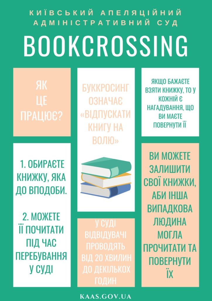 Київський апеляційний адміністративний суд став частиною цього всесвітнього руху книжок. Відвідувачі проводять у суді від 20 хв до декількох годин. Тепер під час перебування у суді Ви матимете змогу почитати сучасних українських письменників, класиків, мотиваційну та професійну літературу, іноземні книжки. Якщо Ви бажаєте взяти вподобану книжку, то у кожній є нагадування, що її треба повернути.