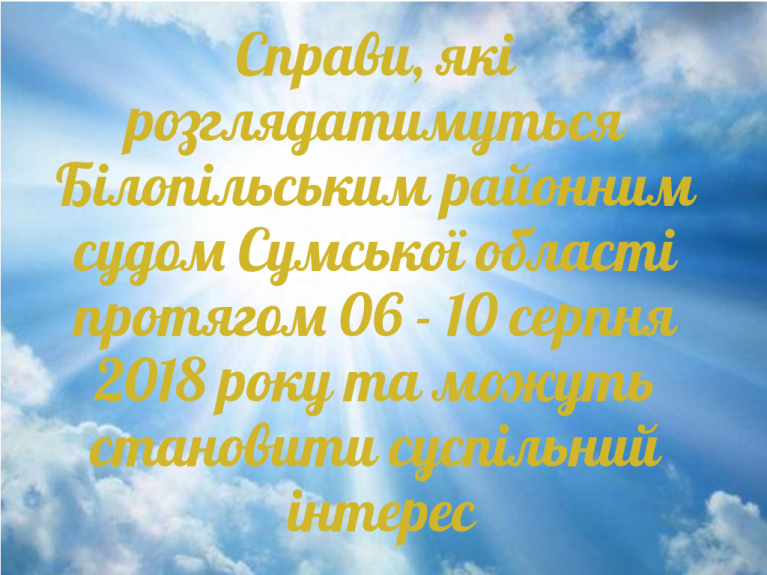 10.00 година 10 серпня 2018 року - кримінальне провадження відносно колишніх прокурора прокуратури м. Сум С. і слідчої слідчого відділу Сумського МВ УМВС України в Сумській області П., обвинувачених за ч. 2 ст. 372 КК України. У судовому засіданні будуть допитуватися свідки.