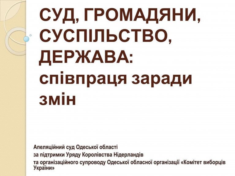 Сьогодні розпочався другий етап роботи в рамках реалізації міжнародного проекту «Суд, громадяни, суспільство, держава: співпраця заради змін», що був запроваджений у травні цього року за ініціативою Апеляційного суду Одеської області за підтримки Уряду Королівства Нідерландів та Одеської обласної організації «Всеукраїнська громадська організація» Комітет виборців України» з метою впровадження єдиних прозорих та зрозумілих для відвідувачів суду стандартів здійснення правосуддя та забезпечення його організації на європейському рівні.