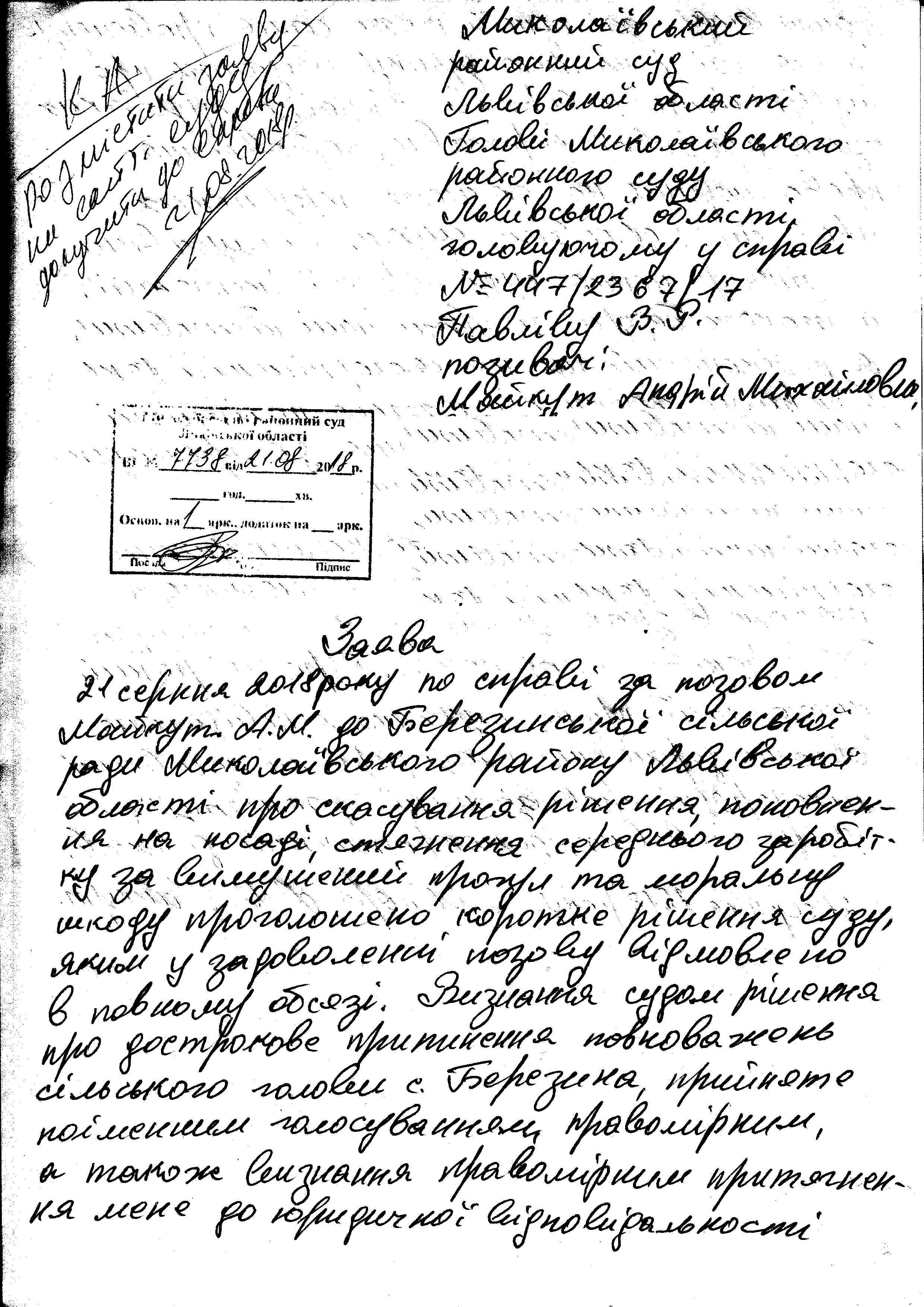 21 серпня 2018 року Миколаївським районним судом Львівської області винесено рішення у справі за позовом Майкута А.М. до Березинської сільської ради Миколаївського району Львівської області про скасування рішення, поновлення на роботі, стягнення середнього заробітку та моральної шкоди, яким у задоволенні позову відмовлено.