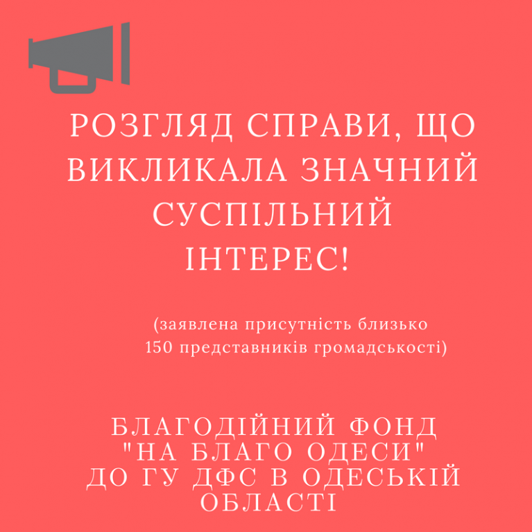 Зважаючи на те, що з боку благодійного фонду "НА БЛАГО ОДЕСИ" надійшло клопотання про забезпечення проведення судового засідання у залі місткістю до 150 осіб, вказана справа викликає значний суспільний інтерес.