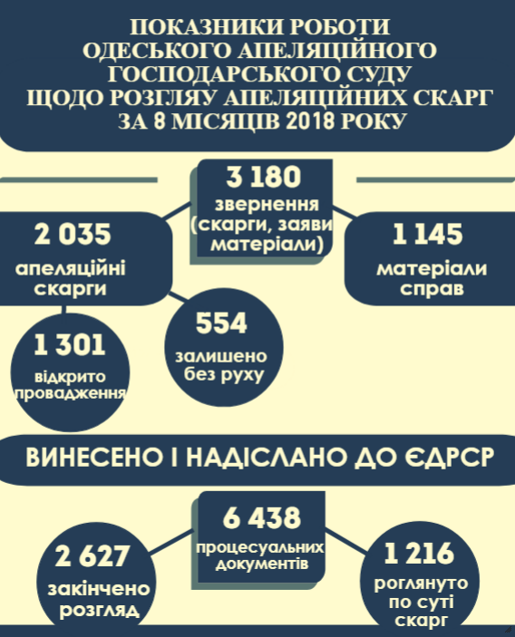Згідно статистичних даних за 8 місяців 2018 року на розгляді Одеського апеляційного господарського суду перебувало 3 180 звернень, з них апеляційних скарг – 2 035, матеріалів – 1 145. Слід зазначити, що у другому кварталі поточного року збільшилось надходження звернень на 23,5%, а апеляційних скарг - на 39,5 % порівняно з першим кварталом.