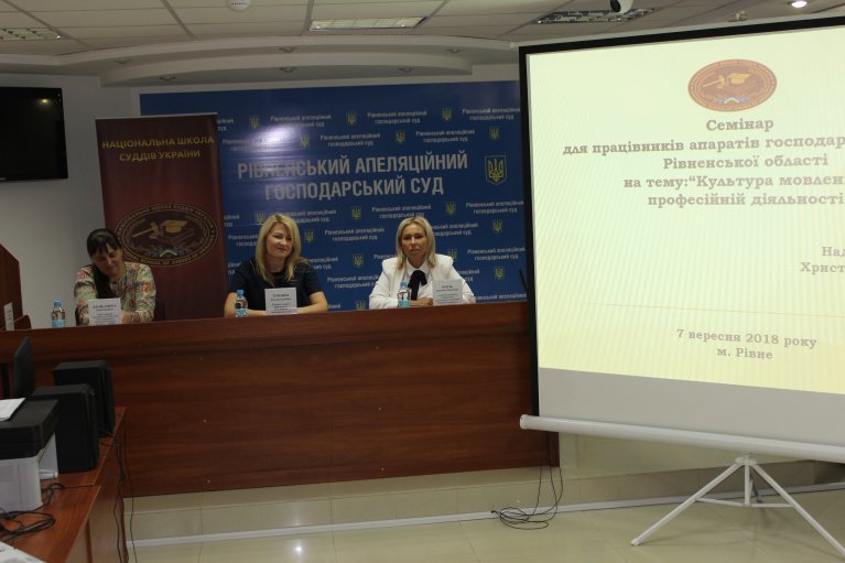 Сьогодні у стінах Рівненського апеляційного господарського суду пройшов семінар на тему “Культура мовлення у професійній діяльності”, який провели викладачі Львівського відділення Національної школи суддів України: доцент кафедри менеджменту та соціальних наук Львівського навчально-наукового інституту ДЗВНЗ “Університет банківської справи”, кандидат філологічних наук, доцент Надія Дзеньдзюра, суддя Рівненського районного суду Рівненської області Христина Гладишева Володимирівна, а також Христина Хміль – головний спеціаліст Львівського регіонального відділення Національної школи суддів України.