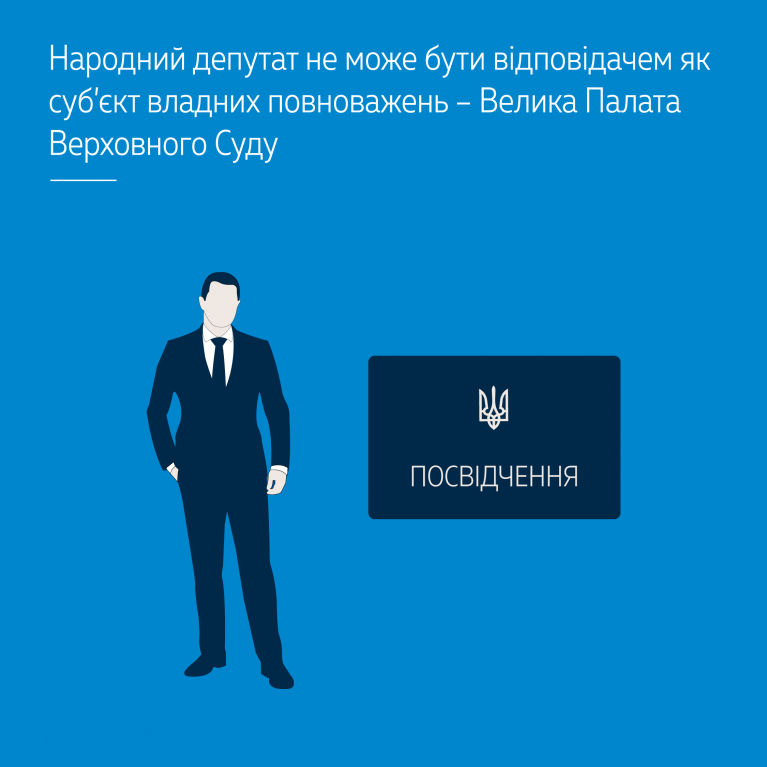 Із такими висновками погодилась і Велика Палата Верховного Суду, зауваживши, що народний депутат не є ані посадовою, ані службовою особою органу державної влади чи органу місцевого самоврядування, а тому не може бути відповідачем як суб’єкт владних повноважень з приводу реалізації його компетенції у сфері управління.