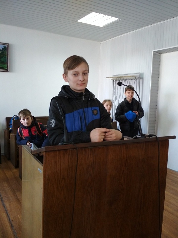 Про особливості роботи судді, в доступній і цікавій формі розповіла школярам в.о. голови суду Анастасія Павлійчук. Крім цього, в.о. голови суду показала дітям і обов’язкову атрибутику судді: справжню суддівську мантію з нагрудним знаком.