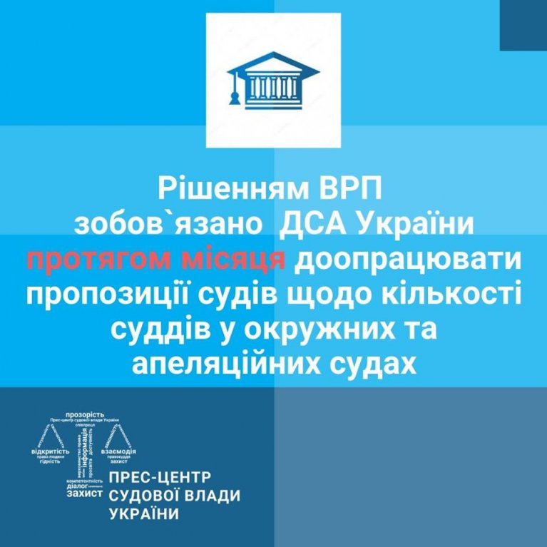 Зобов’язати Державну судову адміністрацію України опрацювати пропозиції апеляційних судів та в місячний термін передати Вищій раді правосуддя доопрацьовані пропозиції щодо кількості суддів в апеляційних судах. Рішення прийнято з техніко-юридичними правками.