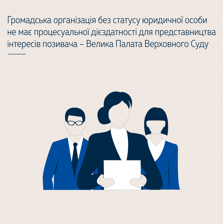Проаналізувавши приписи Конституції України, Закону України від 2 червня 2016 року № 1404-VIII «Про виконавче провадження» та ЦПК України, ВП ВС встановила, що з метою забезпечення інтересів правосуддя та виконання завдання цивільного судочинства ЦПК України не передбачає права громадської організації без статусу юридичної особи бути представником у суді, оскільки таке право належить лише адвокатові, законному представникові, а у спорах, що виникають із трудових відносин, та у малозначних спорах – фізичній особі, яка досягла вісімнадцяти років і має цивільну процесуальну дієздатність.