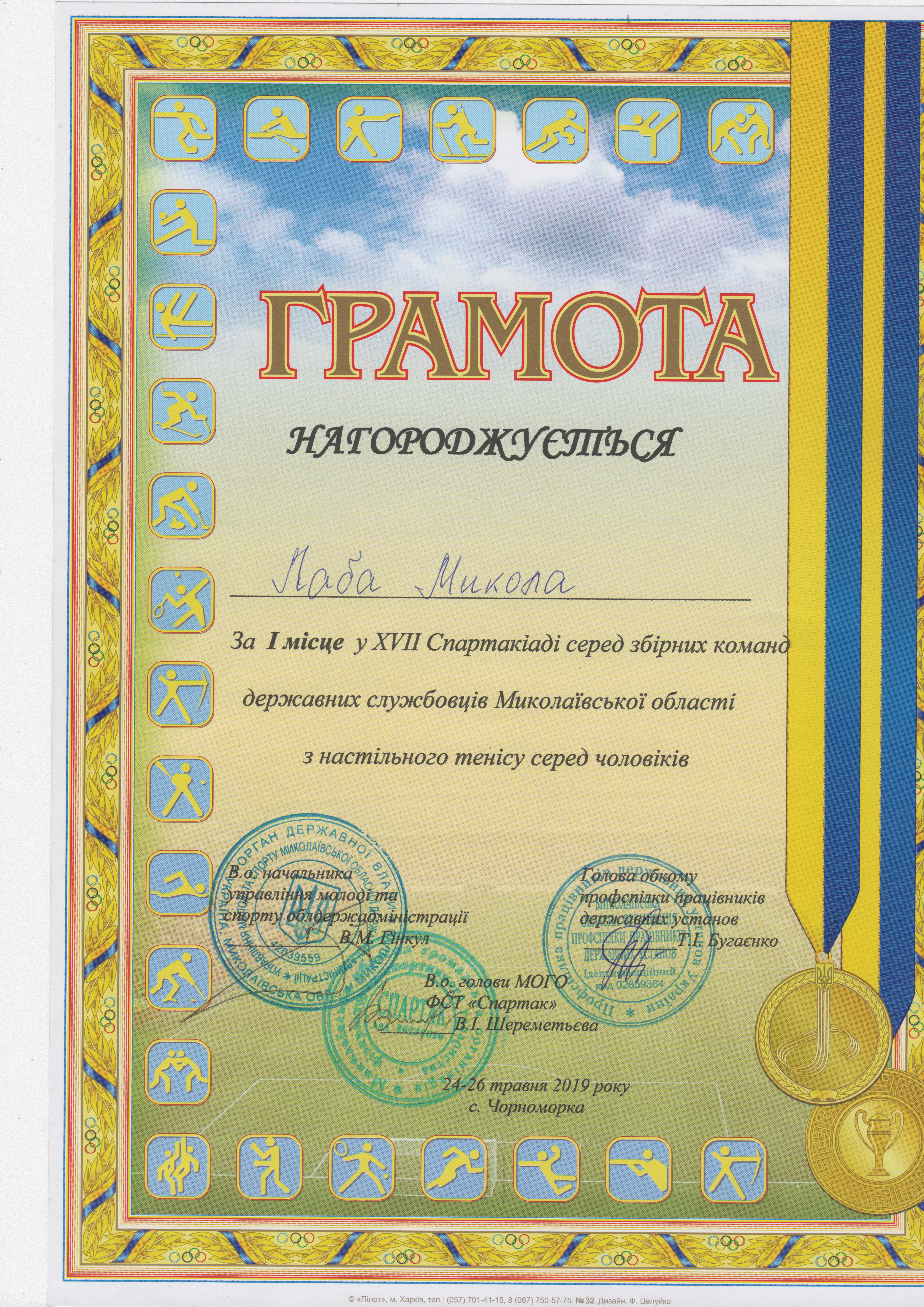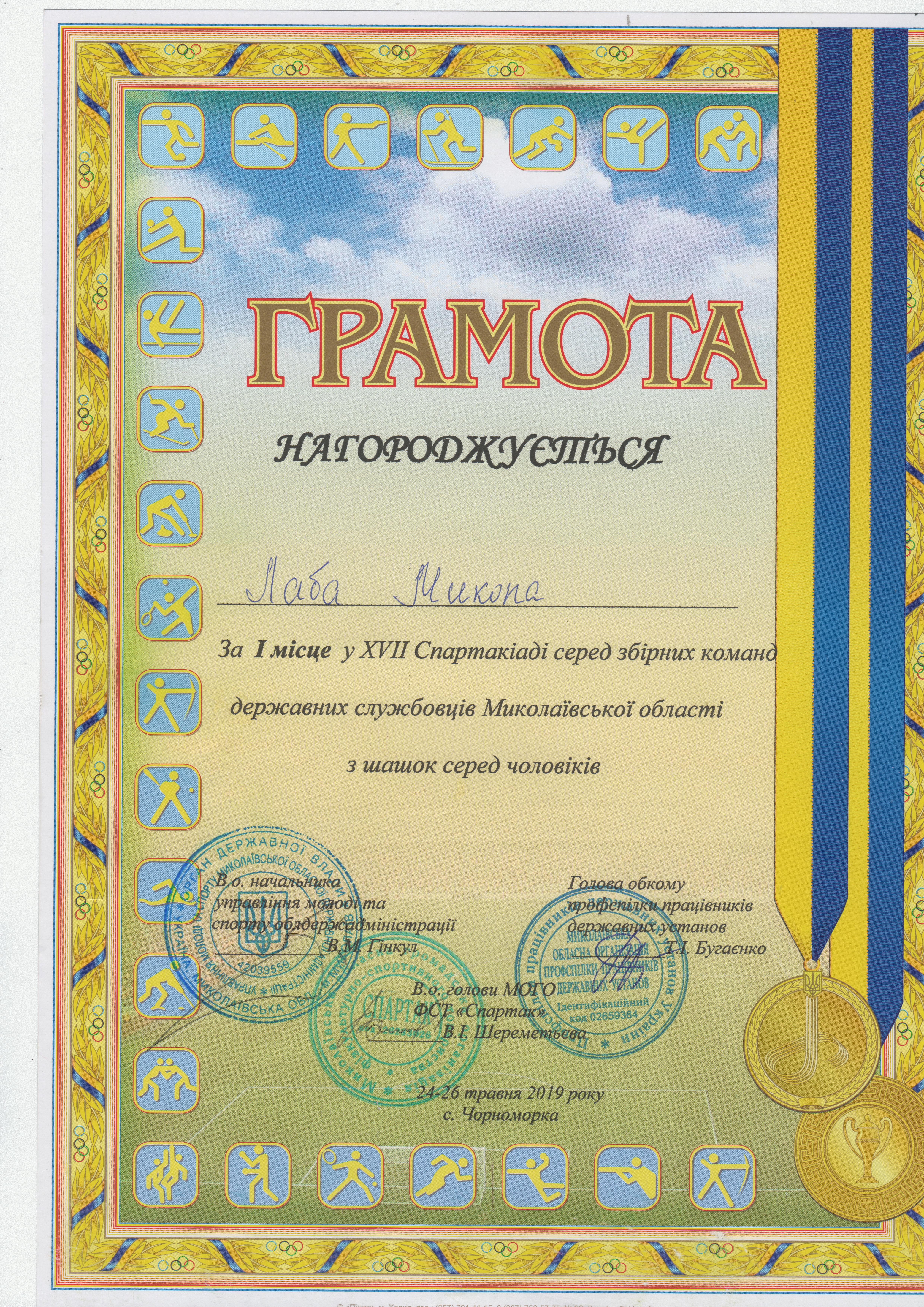 З 24 по 26 травня 2019 року в с.Чорноморка Очаківського району Миколаївської області відбулась ХVII Всеукраїнська спартакіада серед збірних команд державних службовців Миколаївської області. Спартакіада проводилась з метою залучення державних службовців до занять фізичною культурою та спортом та пропаганди здорового способу життя. Учасники змагались у 5 видах спорту, а саме у волейболі, настільному тенісі, футболі, шахах та шашках.