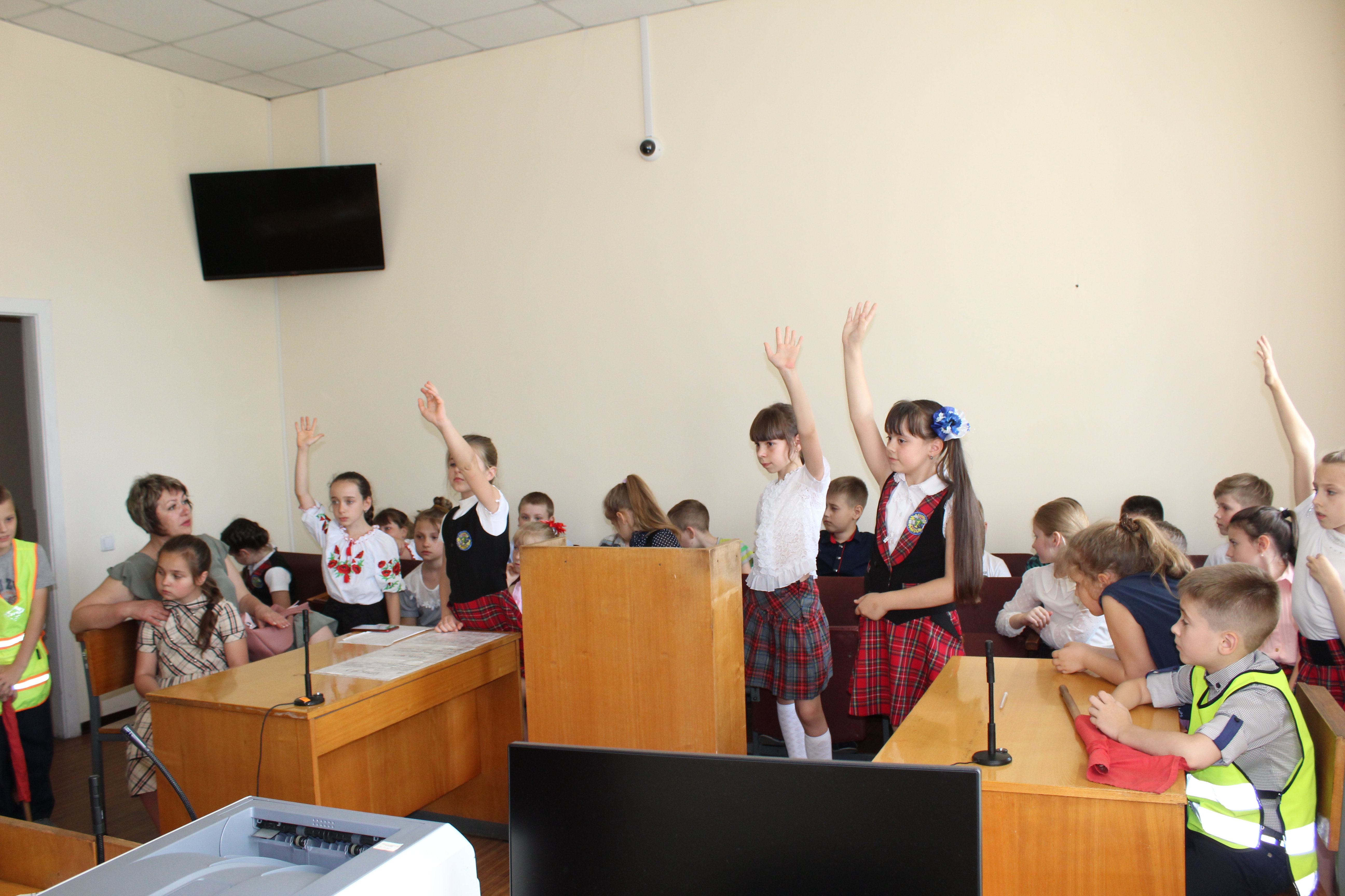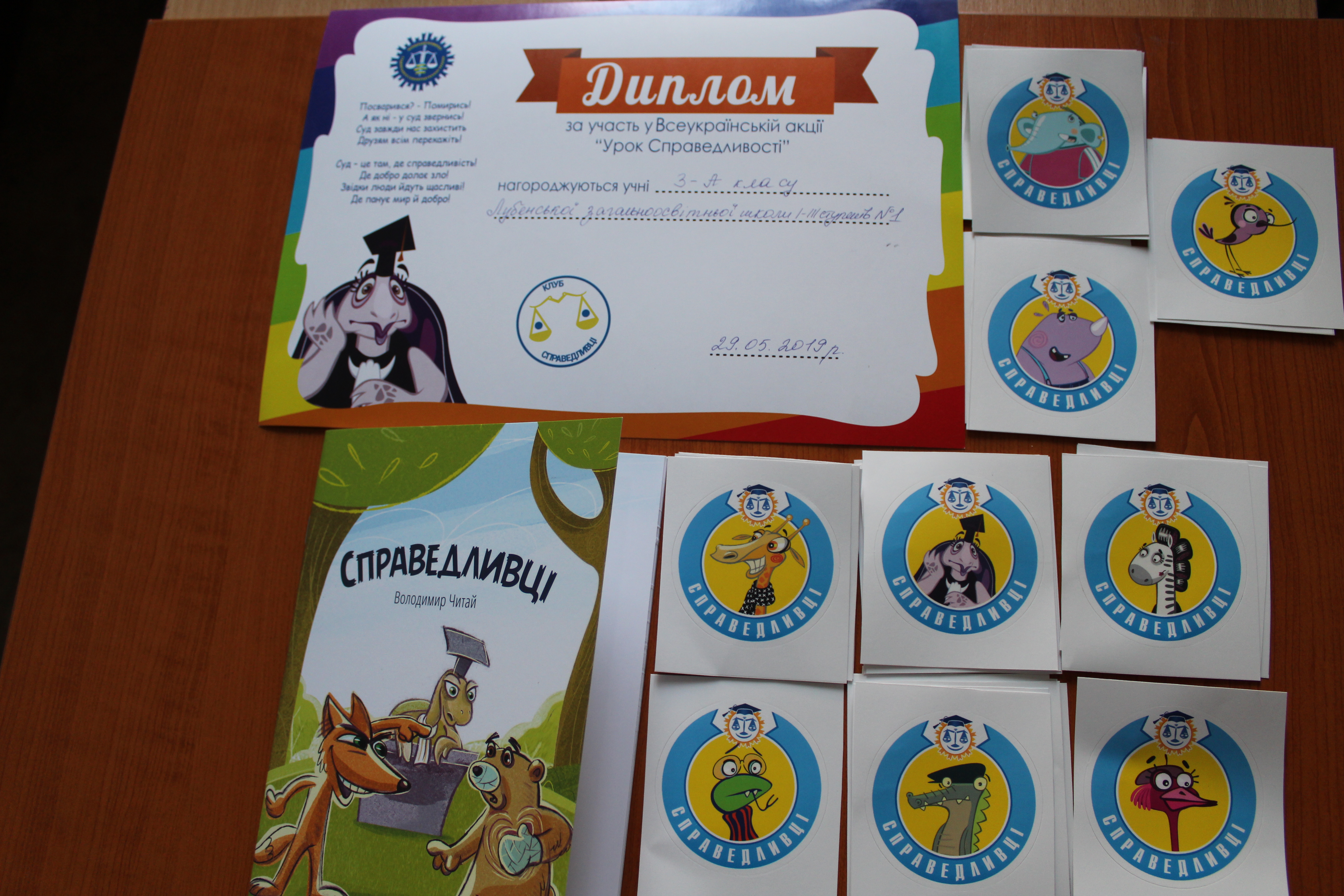 Під час «Уроку справедливості» діти також ознайомилися з невід’ємними атрибутами здійснення суддею правосуддя – нагрудним знаком та мантією. А також дізналися, як саме можна стати суддею, скільки суддів працює у суді на даний час та як відбувається судовий процес взагалі.