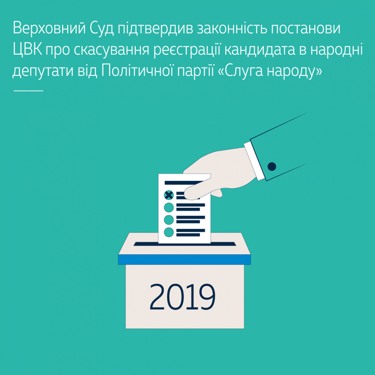 Голова Політичної партії «Слуга народу» подав до ЦВК звернення, в якому просив скасувати рішення ЦВК від 24 червня 2019 року № 1233 щодо реєстрації кандидатів у народні депутати осіб, у списку яких є позивачка. Однією з підстав такого звернення стало подання Вищої ради партії «Слуга народу» від 6 липня 2019 року № 1 «Про виключення з виборчого списку кандидатів у народні депутати України від Політичної партії "Слуга народу" у загальнодержавному багатомандатному виборчому окрузі на позачергових виборах народних депутатів України 21 липня 2019 року».